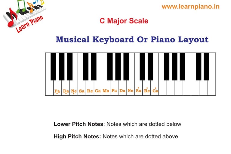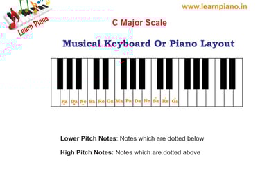 Musical notes lower to scale notes are termed as lower pitched notes. The note is dotted below in the representation of musical notes. Similarly, musical notes higher to scale notes are termed higher-pitched notes. In the representation of musical notes, the notes are dotted above. Refer to the diagram below to understand better. You find lower and high-pitch notes in the above Jumping Notes 2 exercises.